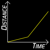 It then suddenly increased its speed, covering a much larger distance in the same time. This sort of motion is not very realistic, but is easy to understand. It also makes calculations easier!