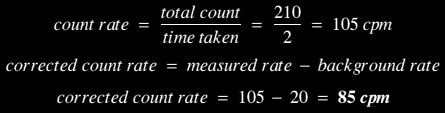 This is when we remove the background count from that which came from our radioactive source. Let's see an example: e.g. A student finds that her antique watch is radioactive (must be the illuminous paint?). A Geiger Counter records a total of 210 counts in 2 minutes. What is the count rate, assuming a background of 20 cpm?
