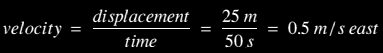 She walks 50 m north, 25 m east and 50 m south. This takes 50 seconds.