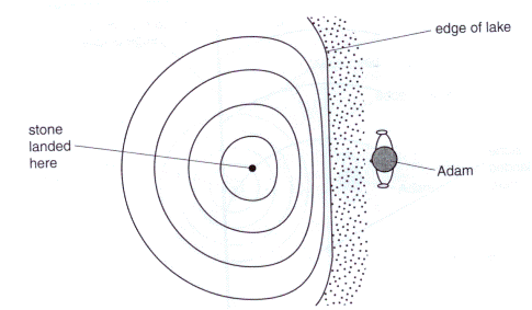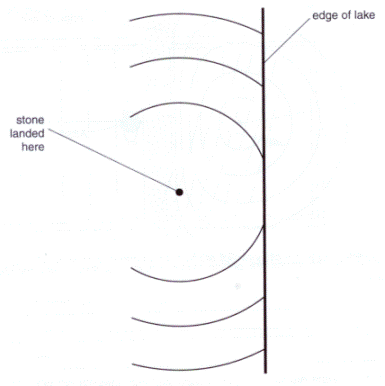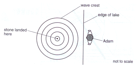 [3] (c) Adam goes to another part of the lake where there is a beach. He throws in a stone. This is what he sees.