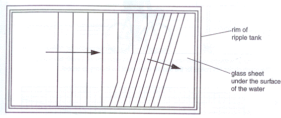 (i) State what happens to each of the following as the ripples change direction in the tank. wavelength [1] speed [1] frequency [1] (ii) On the diagram, carefully draw a line to show the edge of the glass sheet that causes the ripples to change direction. [1] [Total: 15] Hints and Answers coming soon!